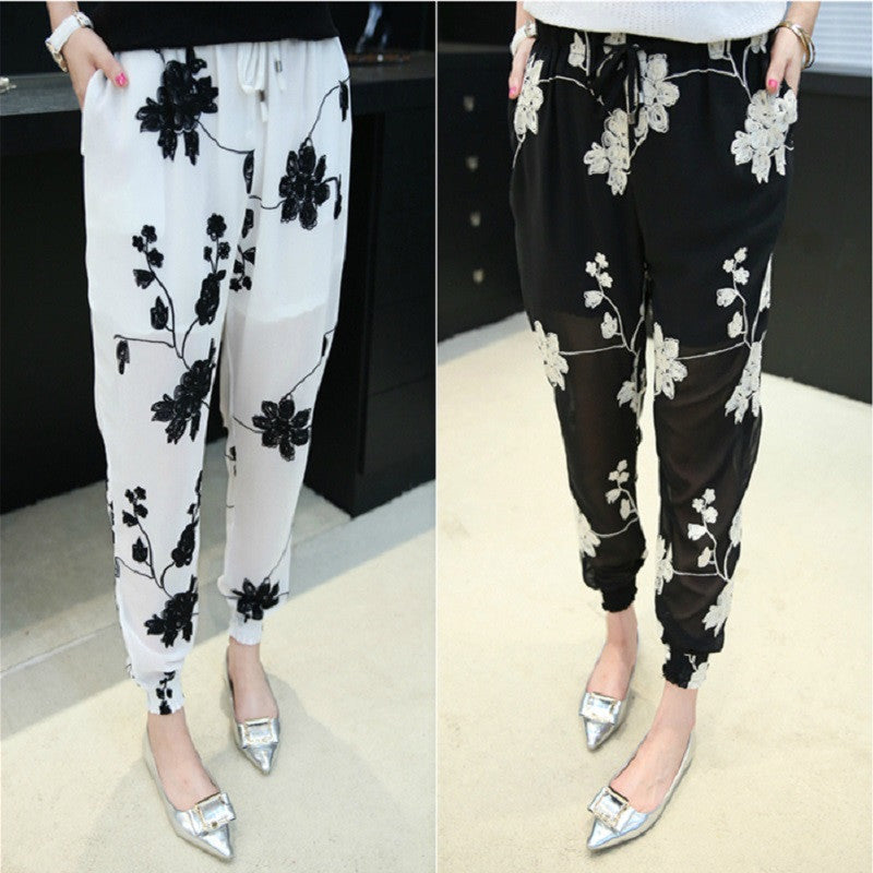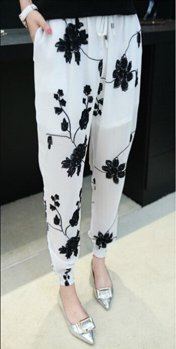 Gender: WomenDecoration: Embroidery,PleatedFit Type: LoosePant Style: Harem PantsPattern Type: PrintFront Style: PleatedStyle: FashionWaist Type: MidFabric Type: ChiffonMaterial: Cotton,PolyesterLength: Full LengthClosure Type: Elastic WaistPants pants: Haren pantsHigh waist pants: Natural waistFabric: Chiffon 51-70%Color classification: White blackSize: M L XL 2XL 3XL 4XLFashion design details: Embroidery AsymmetryThickness: ThinItem Type: 9 points Length