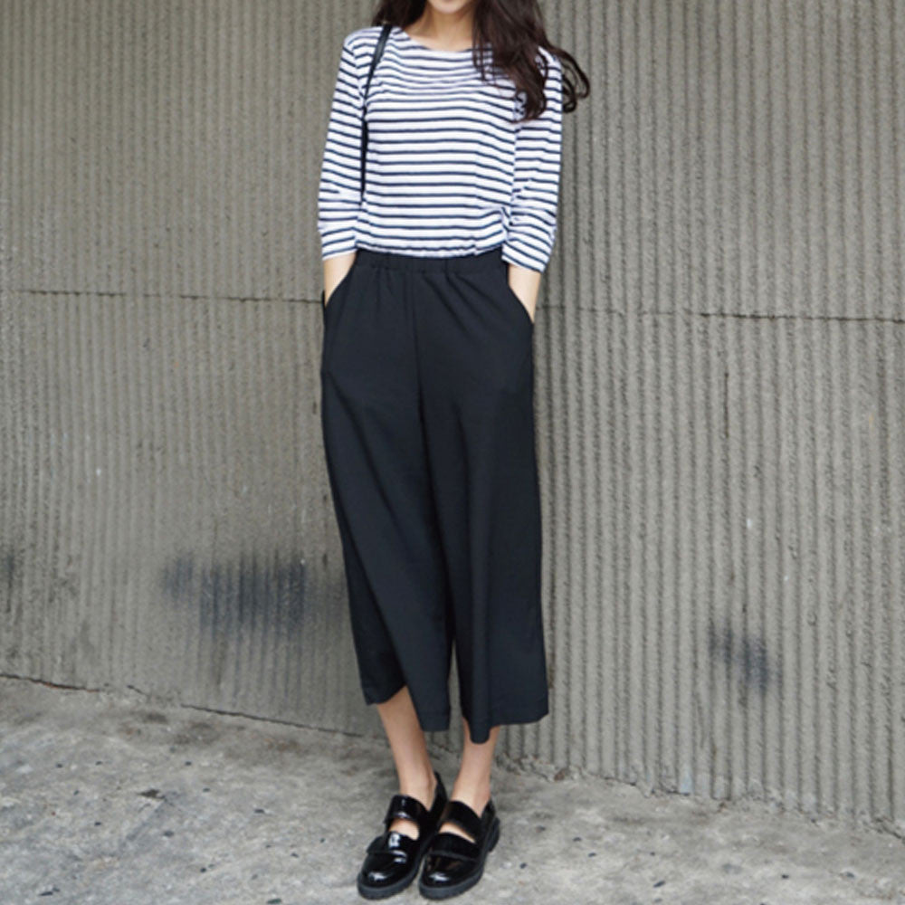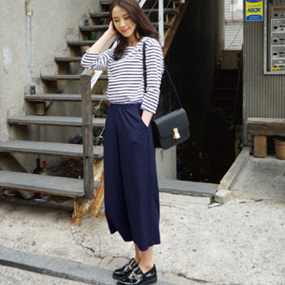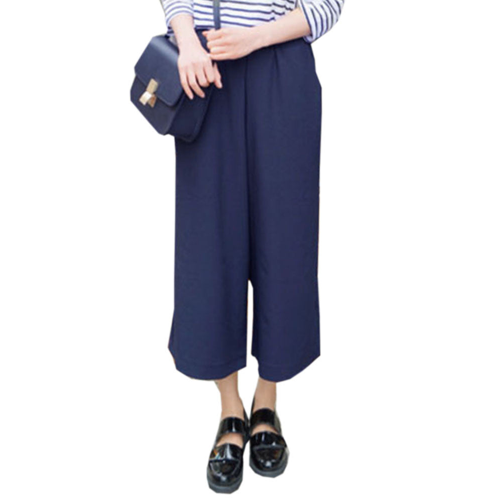 Gender: WomenDecoration: PocketsFit Type: LoosePant Style: Wide Leg PantsPattern Type: SolidFront Style: FlatStyle: FashionWaist Type: HighFabric Type: WovenMaterial: Cotton,PolyesterLength: Ankle-Length PantsClosure Type: Elastic WaistLength: Nine pantsPants: Wide leg pantsFabric: Cotton blended fabricStyle: FashionColor: Dark blue blackSize: S M L XL 2XL