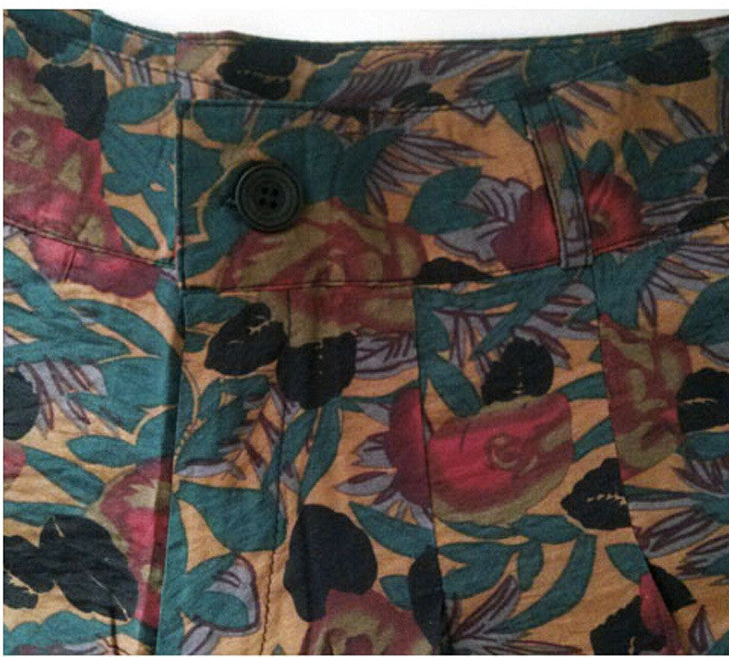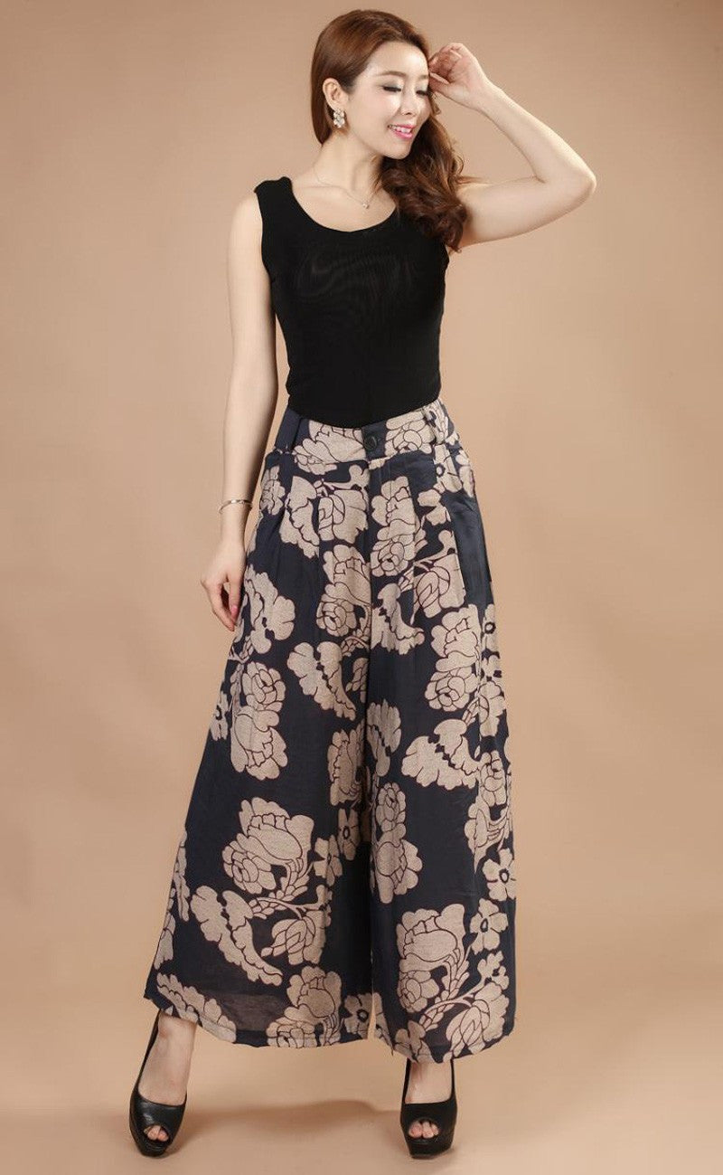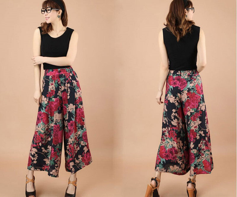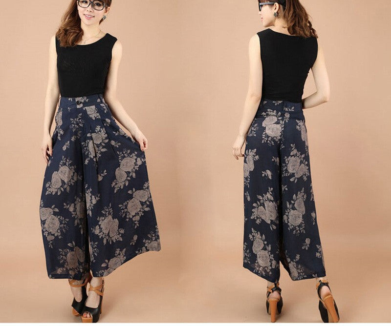 Gender: WomenDecoration: Pockets,PatternFit Type: LoosePant Style: Wide Leg PantsPattern Type: PrintFront Style: FlatStyle: CasualWaist Type: HighFabric Type: BroadclothMaterial: Cotton,LinenLength: Full LengthClosure Type: Button FlyColor Style: Contrast ColorThickness: Lightweight